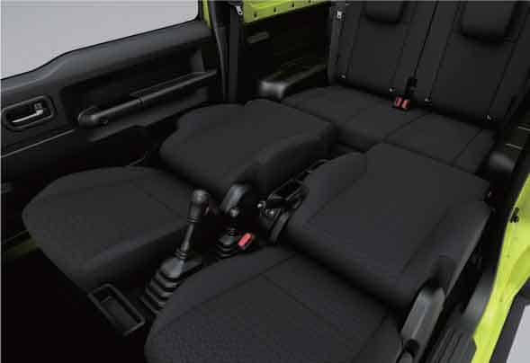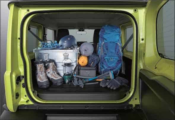 The Jimny is conceived and designed for long-distance drives, with ample space for luggage. Back seats fold to allow for storage area. Wide luggage can be stored by folding seats flat. Accessories like luggage bars, nets and utility hooks can be supported by screw holes. Enough small pockets and trays are provided for mugs, phones and any other gadgets. USB and accessory sockets are also provided to power multiple devices.