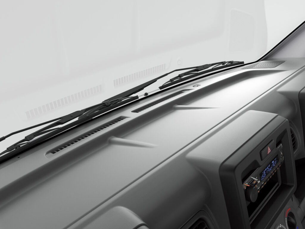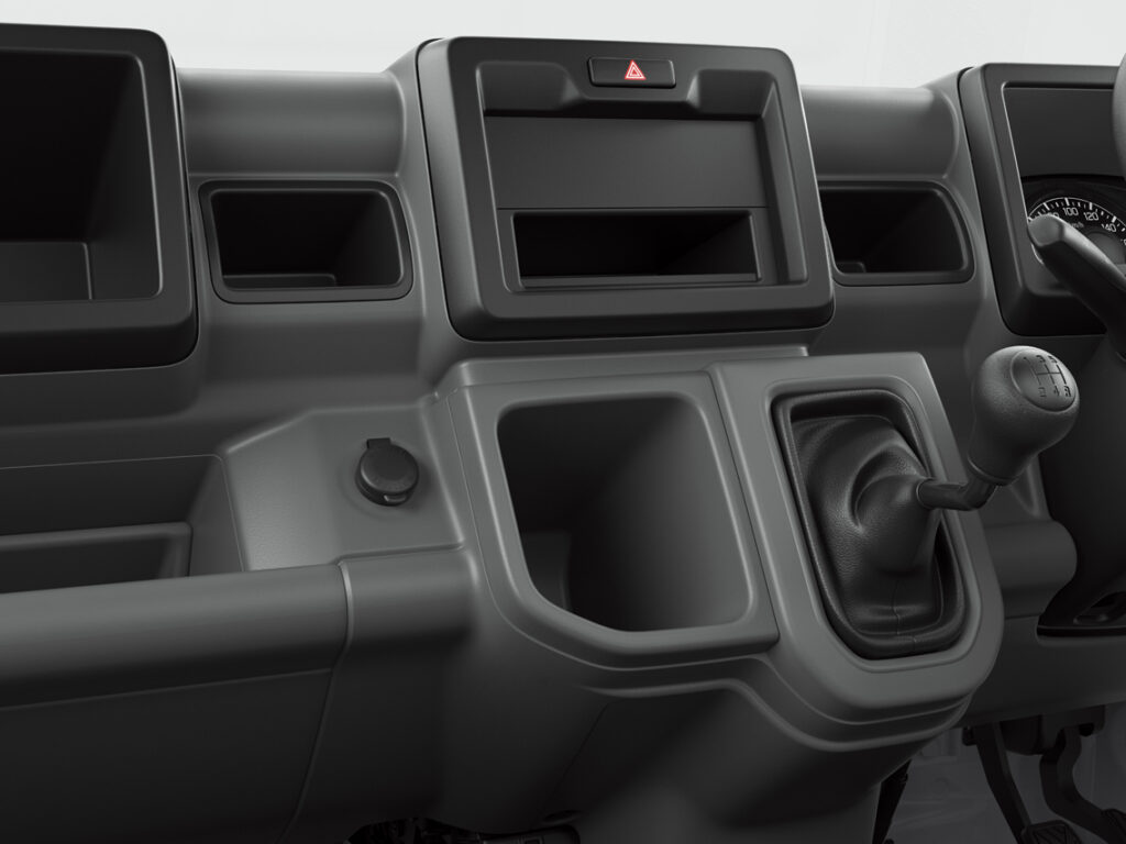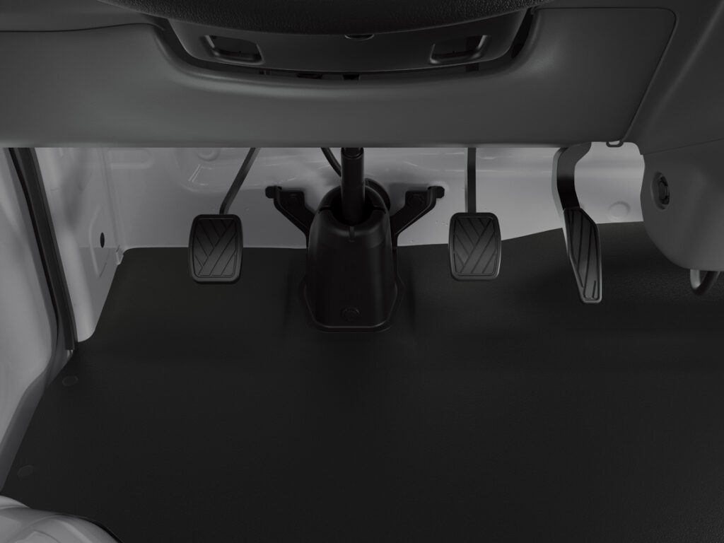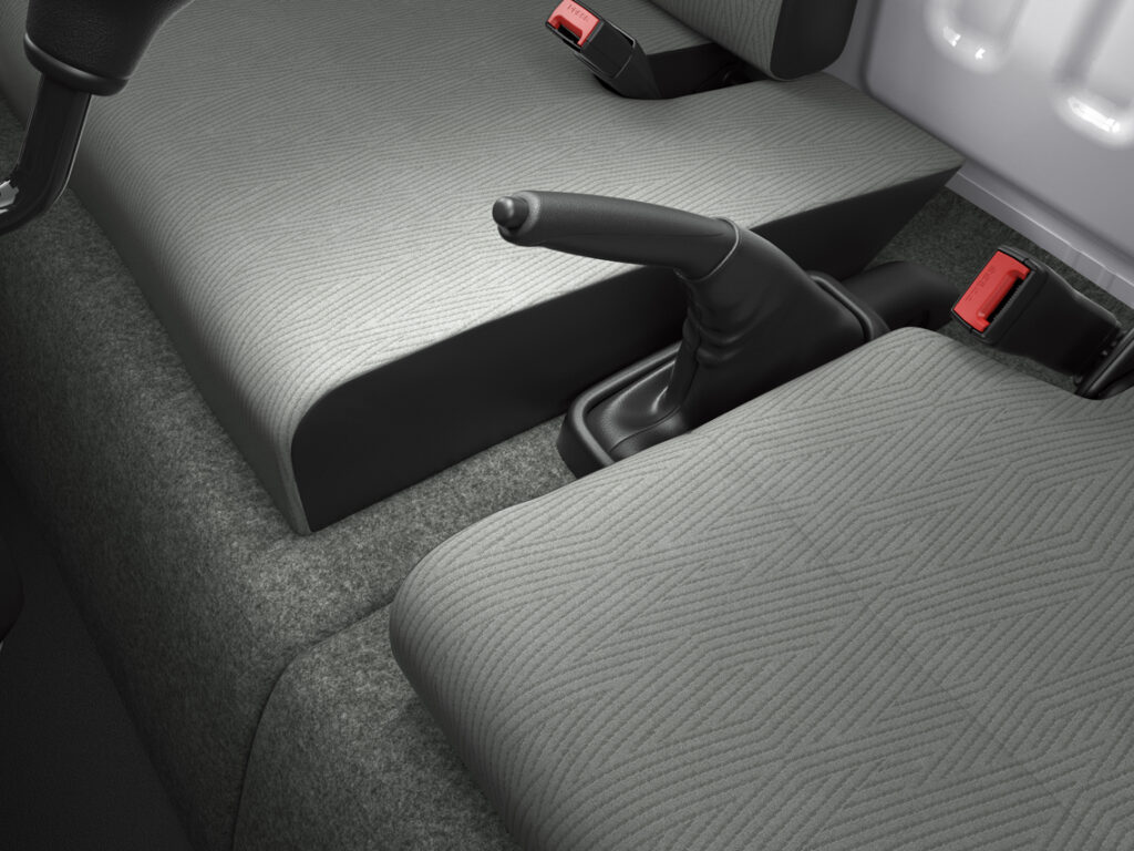 The shift lever is moved from the floor to the dashboard to increase legroom and the full-cab layout also puts the wheelhouse behind the cabin to offer extra legroom for driver and passenger.